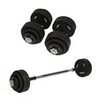 - El juego de mancuernas de 30kg incluye dos mangos de 40cm, cuatro discos de 0,5 kg, cuatro discos de 1,25 kg, ocho discos de 2,5 kg, 4 collares y una barra extendida.