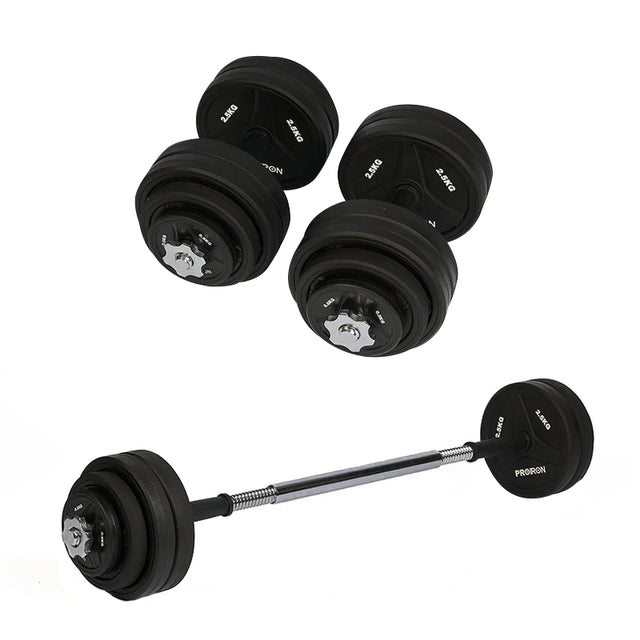 - El juego de mancuernas de 20Kg incluye dos mangos de 40cm, cuatro discos de 0,5 kg, cuatro discos de 1,25 kg, cuatro discos de 2,5 kg, 4 collares y una barra extendida.